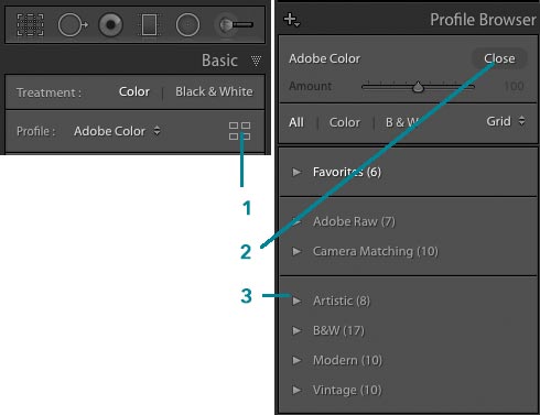 The Profile Browser is located in the Develop Module, under the Basic Tab, and is opened by clicking on the icon with four boxes, shown in 1. The Profiles which you have loaded are shown in 3. To close the Profile Browser and return to the Basic Tab, click the Close Button, shown in 3.